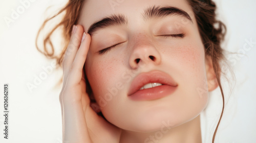 Close-up of a young woman relaxing with her eyes closed and a gentle expression in a serene indoor setting