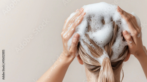 Close-up of a young woman shampooing her hair, with rich foam and a focus on body and hair care, copy space. photo