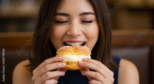 Close-up of a young woman with brown hair happily biting into a delicious cream puff pastry in a cafe