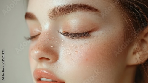 Close-up of a young woman's face with delicate makeup, dewy skin and freckles
