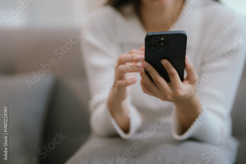 Close-up of a young woman's hand holding a smartphone and chatting on social media.