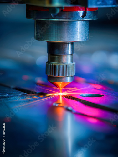 Close-up of advanced laser cutting machine emitting bright sparks while precisely shaping metal sheets in an industrial manufacturing environment
