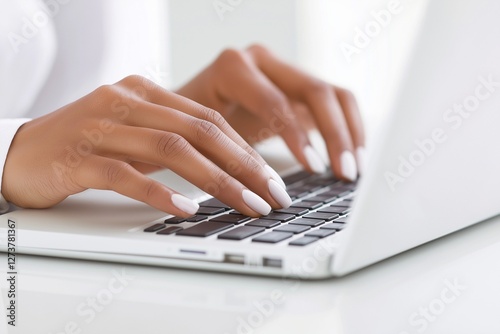 Close-up of African American woman hands with white manicure typing on laptop keyboard