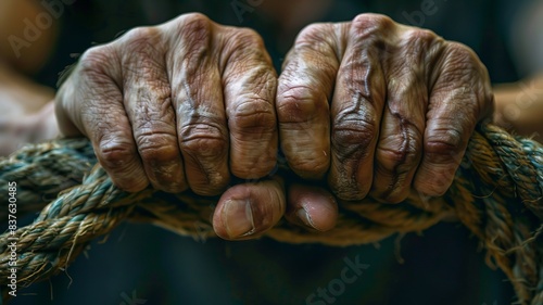 Close-up of aged hands gripping an old rope, conveying strength, hard work, and determination in vivid detail.