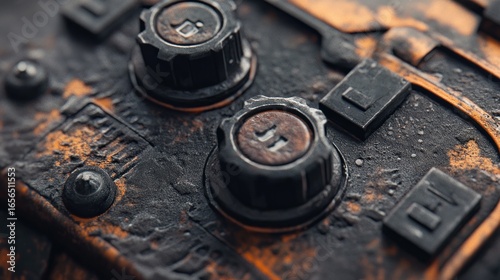 Close-up of aged, rusted electronic device panel with knobs and buttons