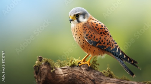 Close-up of an American Kestrel perched on a mossy log with a blurred green background.