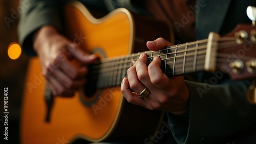 Close-up of an antique jazz guitar and calloused hands strumming soulful melodies. Warm tones and blurred bokeh lights create an intimate vintage jazz lounge vibe.