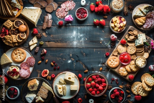 Close-up of an assortment of delicious snack foods, including cheeses, baked goods, sweets, dried fruits, and other savory treats. Ideal for picnics or appetizers.