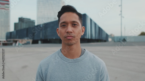 Close-up of an athlete, in sportswear, the guy is focused looking at the camera
