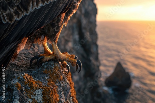 Close-up of an eagle's claws gripping a rocky cliff, overlooking the sea at sunset.