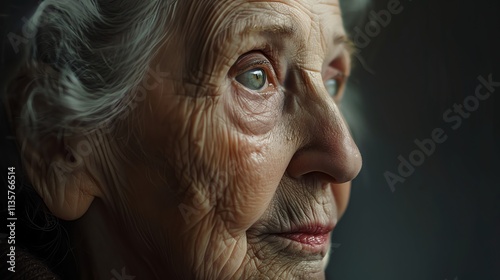 Close-up of an elderly woman's face with thoughtful expression, looking off to the side.