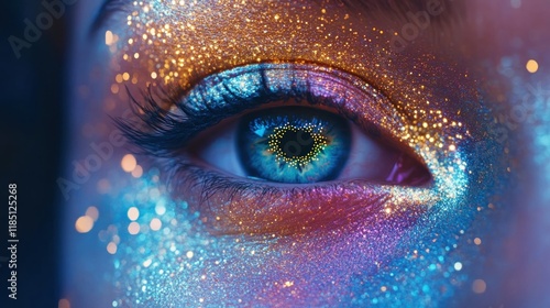 Close-up of an eye reflecting colorful digital lights, symbolizing technology and futuristic vision