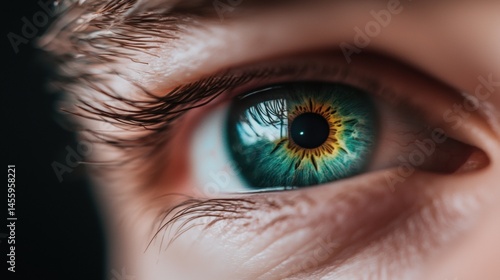 Close-up of an eye with striking blue and yellow iris, surrounded by dark eyelashes and a soft pinkish skin tone.
