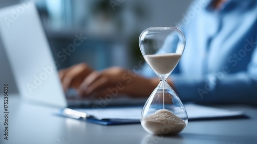 Close-up of an hourglass on an office desk with a blurred person working quickly on a laptop