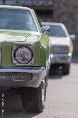 Close-up of an old car. Part of the exterior. An American classic. Chrome lining. Glass with reflection.