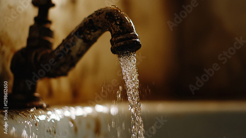 Close-up of an old faucet with water flowing from it, creating splashes. The image symbolizes water, plumbing, home maintenance, and the natural flow of liquid.