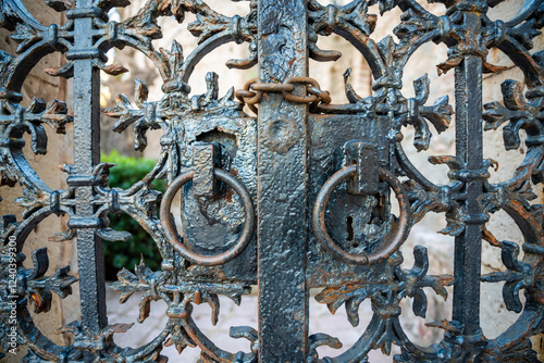 Close-Up of an Old Metal Gate with a Lock on Sveti Stefan Island, Montenegro. A Historic and Weathered Entrance