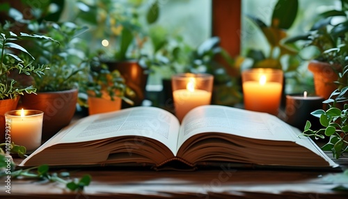 Close-up of an open book on a wooden table surrounded by plants and candles