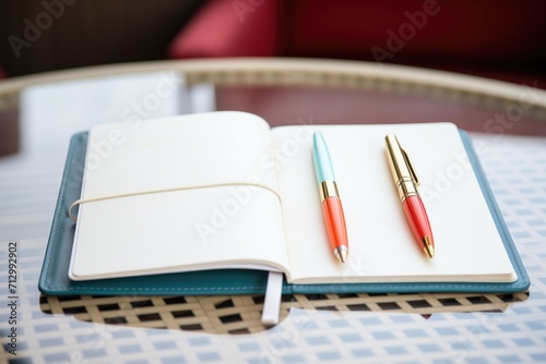 close-up of an open diary with elegant pens beside it