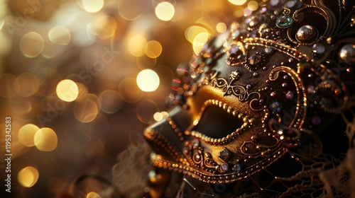 Close-up of an ornate, dark-colored masquerade mask with delicate gold detailing