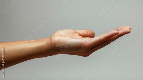 Close-up of an outstretched hand with palm up against a neutral background, perfect for concepts of offering, receiving, or gestures.