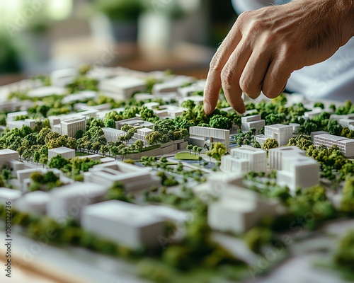 Closeup of an urban planner creating a detailed model with greenery, showcasing sustainable city planning, ecofriendly architecture, and green urban design