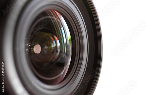 Close-up of an wide angle camera lens with reflections on multi colored light of glass. Isolated on white, copy space