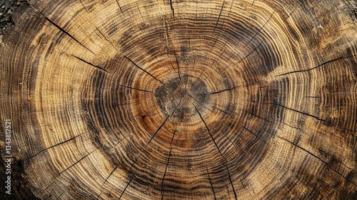 Close-up of ancient tree trunk cross-section with distinct wood rings and cracks, embodying age and resilience. Textured, warm-toned rustic beauty for home decor design.