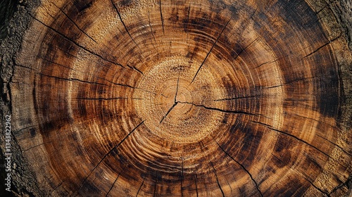 Close-up of ancient tree trunk cross-section with distinct wood rings and cracks, embodying age and resilience. Textured, warm-toned rustic beauty for home decor design.