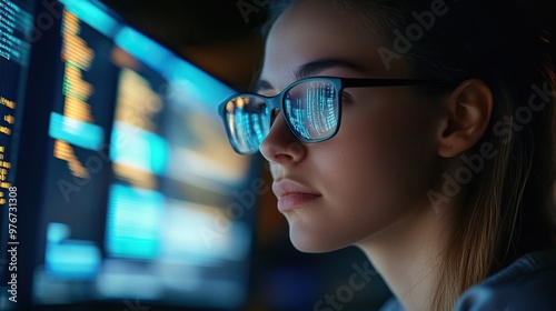 Close-up of Asian woman programmer with glasses reflecting code on computer screen in dark office