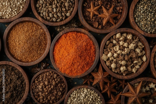 Close-up of assorted spices arranged in wooden containers