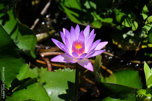 Closeup of beautiful bright purple violet Nymphaea or Water Lily bud in a pond