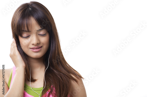 Close-up of beautiful young woman with eyes closed listening music over white background