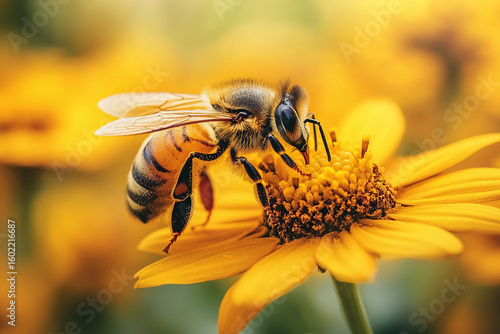 Closeup of bee collecting nectar on yellow flower in vibrant city garden environment, generative ai