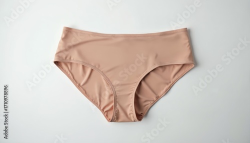 Close-up of beige high-waisted panties against white backdrop. Underwear isolated. Intimate apparel displayed. Womens clothing, essential for fashion. Studio shot with copy space.
