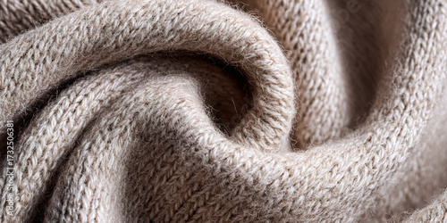 Closeup of beige knitted wool textile folded in soft swirl forming handmade fabric background with natural cozy detail - AI generated