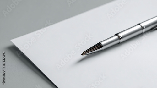 close-up of blank white sheet of paper with generic metal pen resting diagonally across it, smooth clean background with soft natural shadows, modern minimalist design aesthetic