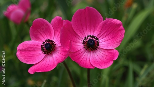 Close-up of blooming Balkan anemone with vibrant pink flowers, highlighting seasonal beauty