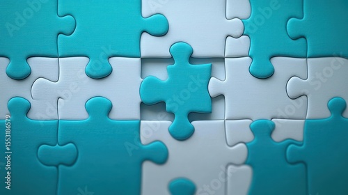 Close-up of blue and white puzzle pieces with one piece raised above the others symbolizing problem solving and incomplete task