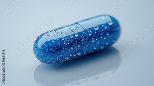 Close-up of Blue Capsule with Water Droplets on Reflective Surface