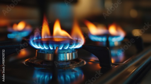 Close-up of blue flames on a gas stove, showcasing cooking energy.
