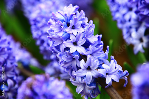 close-up of blue with purple Hyacinth flowers blooming in the garden