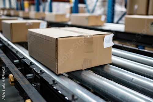 closeup of boxes Cardboard boxes on conveyor rollers inside a warehouse ready to be shipped by courier