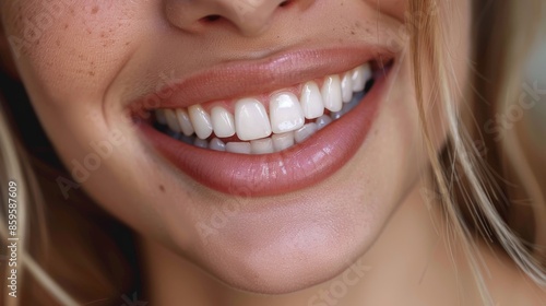 Close-up of bright smiling lips showcasing white teeth, representing happiness, health, and the beauty of a joyful expression in a warmly lit image.