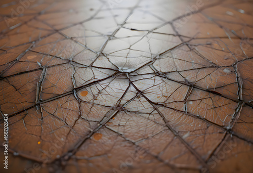 Close-up of broken surface with spiderweb cracks on glossy brown texture, ideal for damaged material textures or abstract concepts.