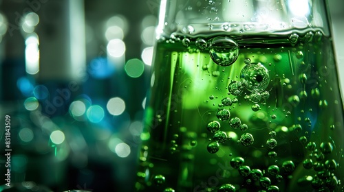 Close-up of bubbling beaker in pharmaceutical lab, vivid green liquid, moody lighting