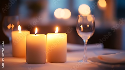 close-up of burning candles flickering on a restaurant table, surrounded by fine dining settings and a warm, inviting atmosphere, with soft shadows playing on the walls