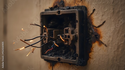 Close-Up of Burnt Wall Socket with Melted Plastic and Scorched Wires – Electrical Fire Damage, Sparks on Dark Background, Fire Hazard, Home Safety Risk, Wiring Failure, Power Outlet Damage