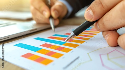 Close-up of business professionals analyzing colorful bar charts and graphs, discussing financial data, and planning strategies.