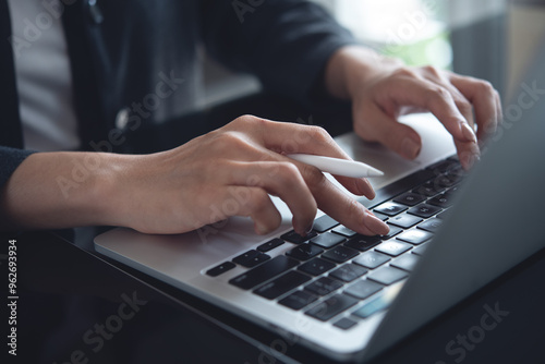 Closeup of business woman hands working and typing on laptop computer keyboard, surfing the internet, searching the information, global internet network, telework, email marketing
